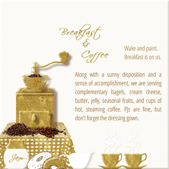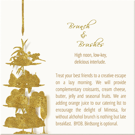 Note that the complexity of the paintings varies. We encourage improvisation, but we also provide the means for setting up the composition for more intricate paintings. This will allow you to dive directly into the joys of color. Each painting employs certain techniques; however, these are adjusted for beginners and the amount of time we have to complete the work. Depending on the project, you may be introduced to the following: color mixing, wash, block out painting, layering, glazing, impasto, dry brushing, palette knife, and more.